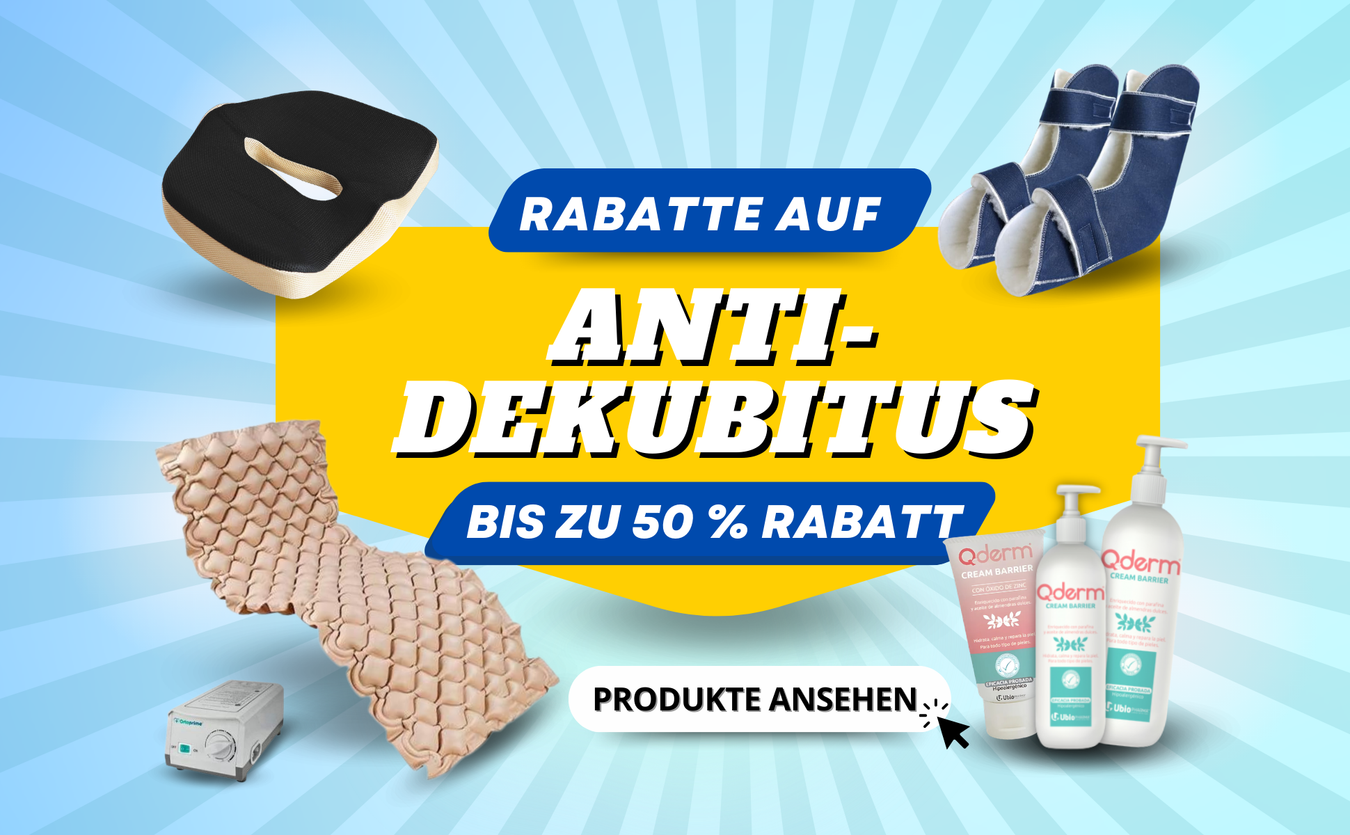 Anti-Dekubitus-Produkte, ideal zur Vorbeugung und Verbesserung von Druckgeschwüren oder Hautverletzungen aufgrund des vom Knochen auf die Dermis ausgeübten Drucks bei Patienten, die aufgrund ihres Krankheitszustands lange Zeit sitzen oder liegen bleiben müssen. Deshalb bieten wir bei OrtoPrime die beste Anti-Dekubitus-Reihe an, mit der wir Ihnen helfen, die geeignetste Lösung basierend auf dem Zustand des Patienten, dem Risiko und der Schwere jedes Falls zu finden. Hervorzuheben sind Anti-Dekubitus-Kissen, Nackenstützen, Condrodermatitis oder Plagiozephalie, Anti-Dekubitus-Fersenschutz, Anti-Dekubitus-Schuhe, Kissen für Druckgeschwüre, Anti-Dekubitus-Stiefel, Ellbogenschoner, Handschuhe und Anti-Dekubitus-Luftmatratzen sowie andere kompatible Ruheprodukte wie elektrische verstellbare Betten und elektrische Lattenroste. Tägliche Pflege mit der Höchsten Garantie für Schutz!